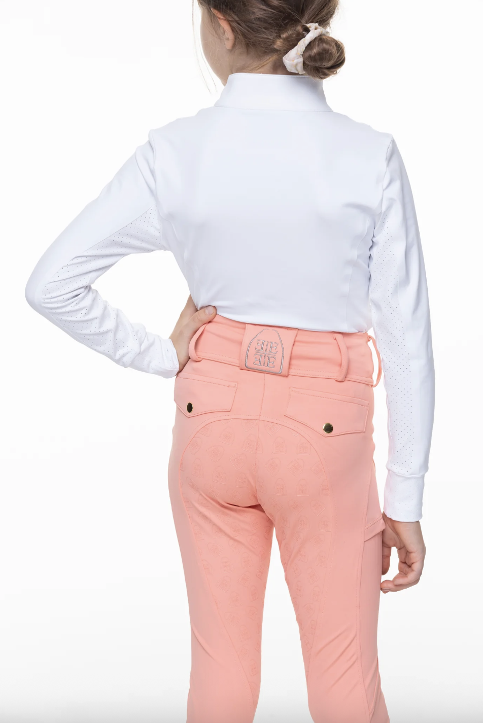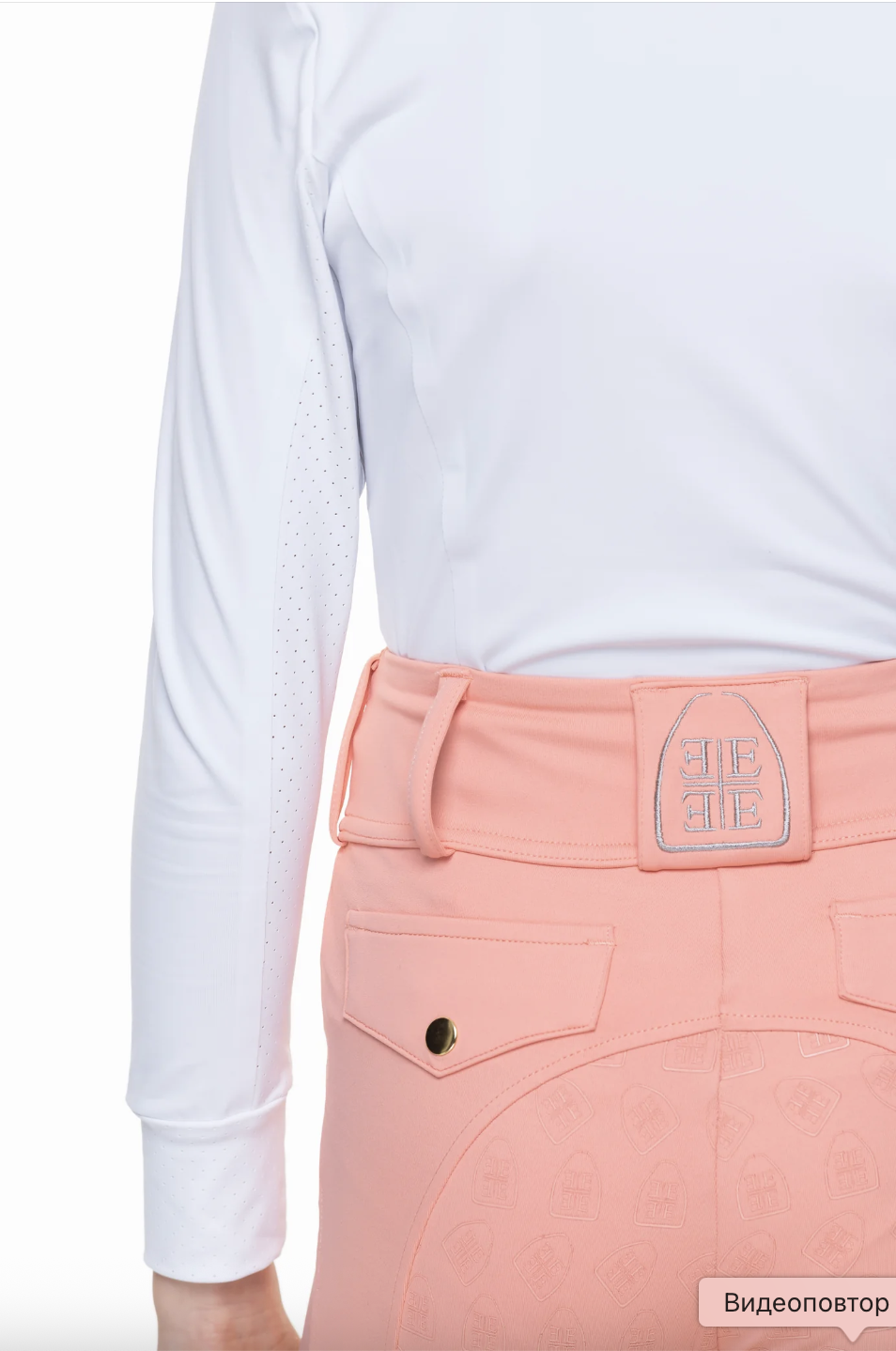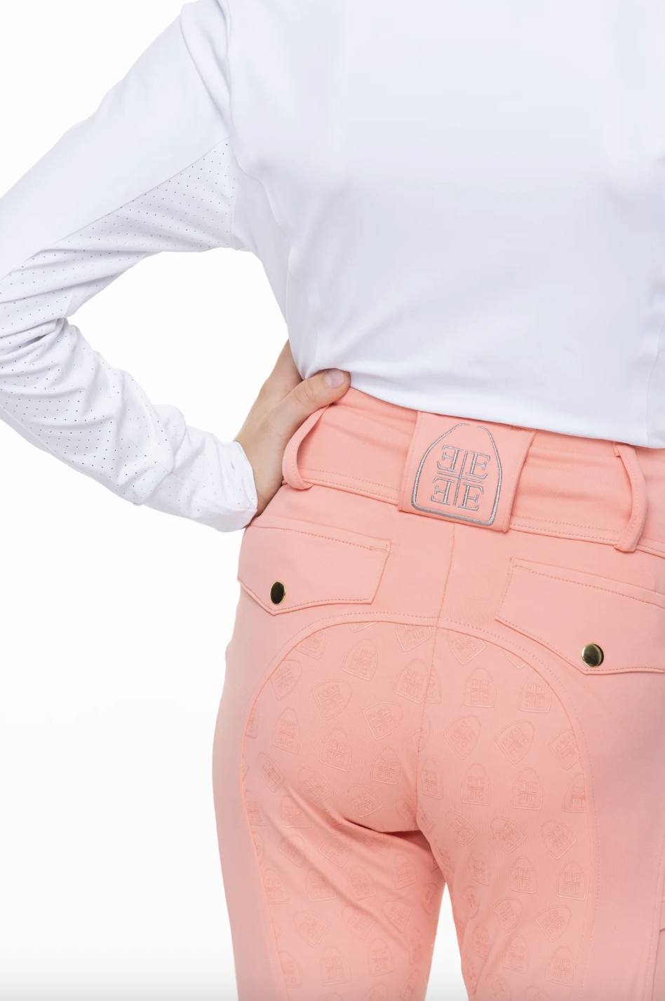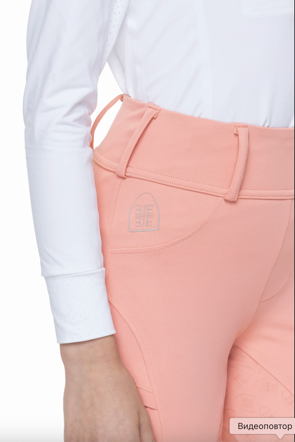 Коралловые бриджи с золотыми пуговицами на задних карманах. Логотипы Equine Epoque выполнены в тёплом сером цвете.