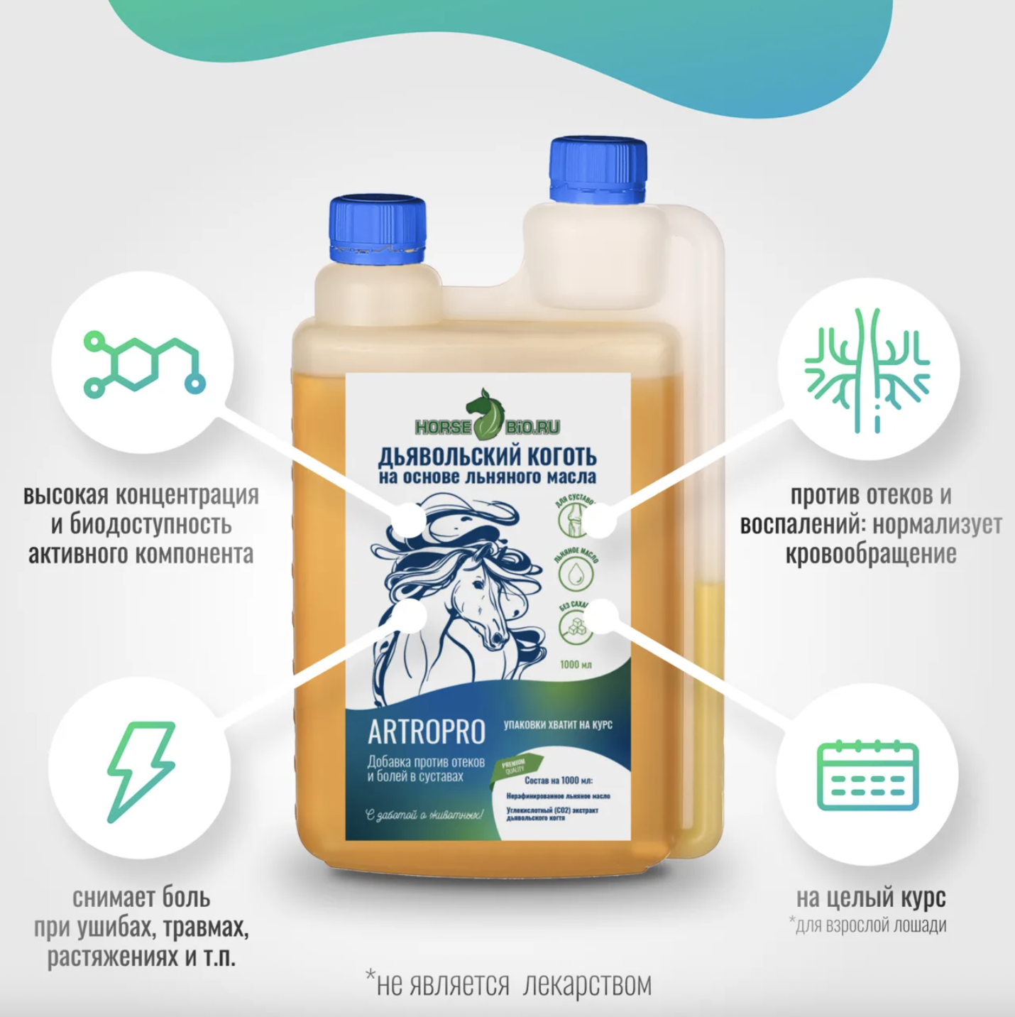1000 мл — упаковка рассчитана на полный лечебный курс (3-4 недели) для взрослой лошади