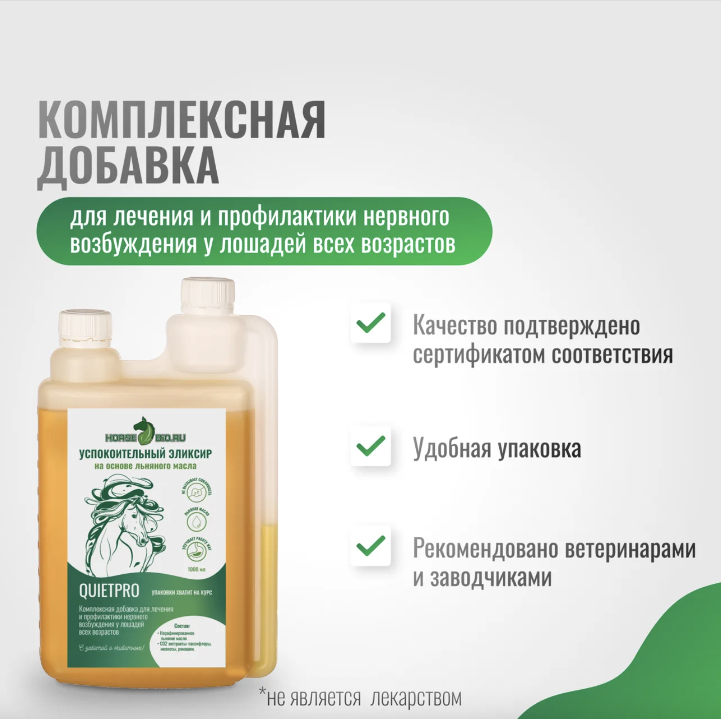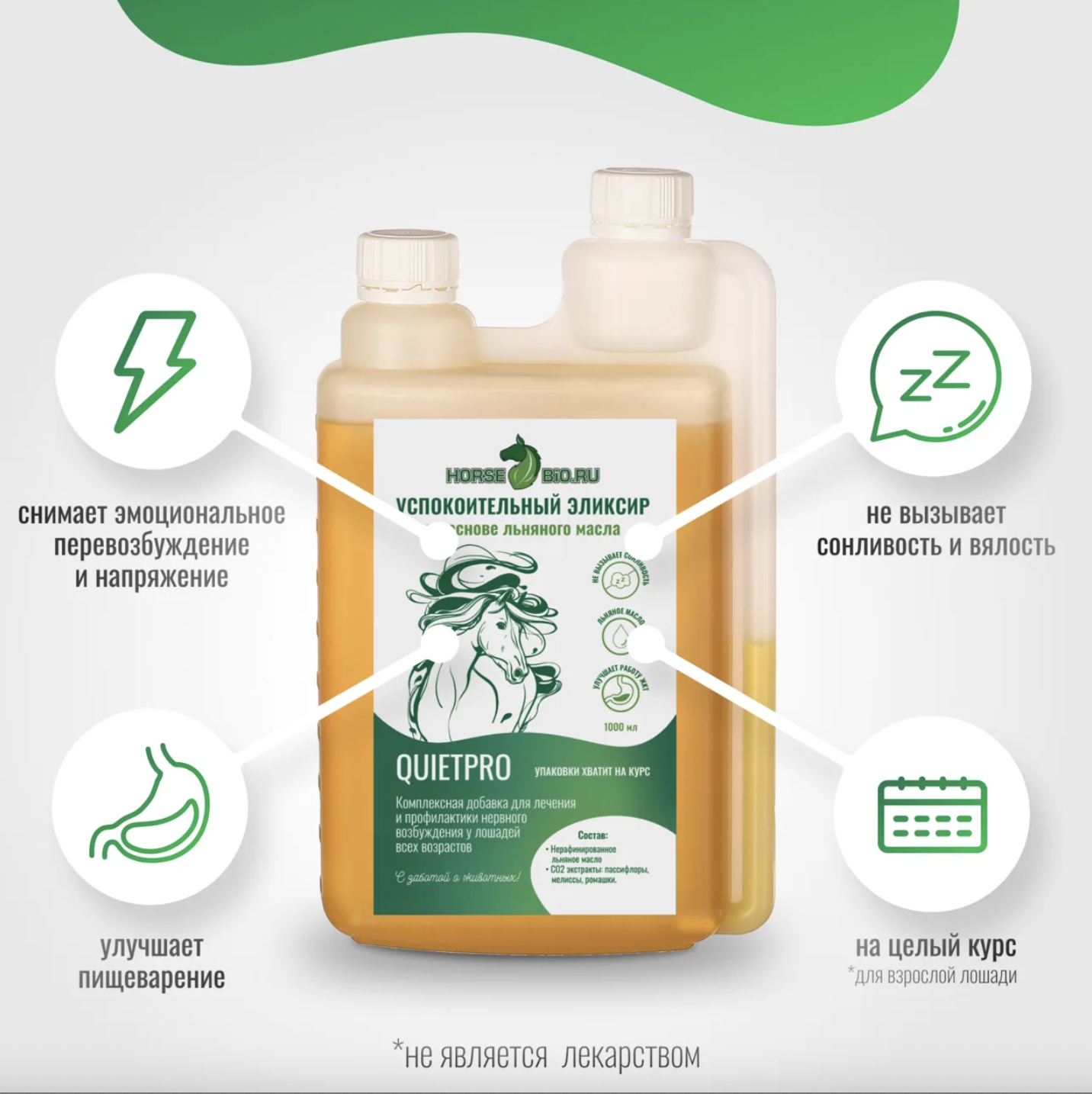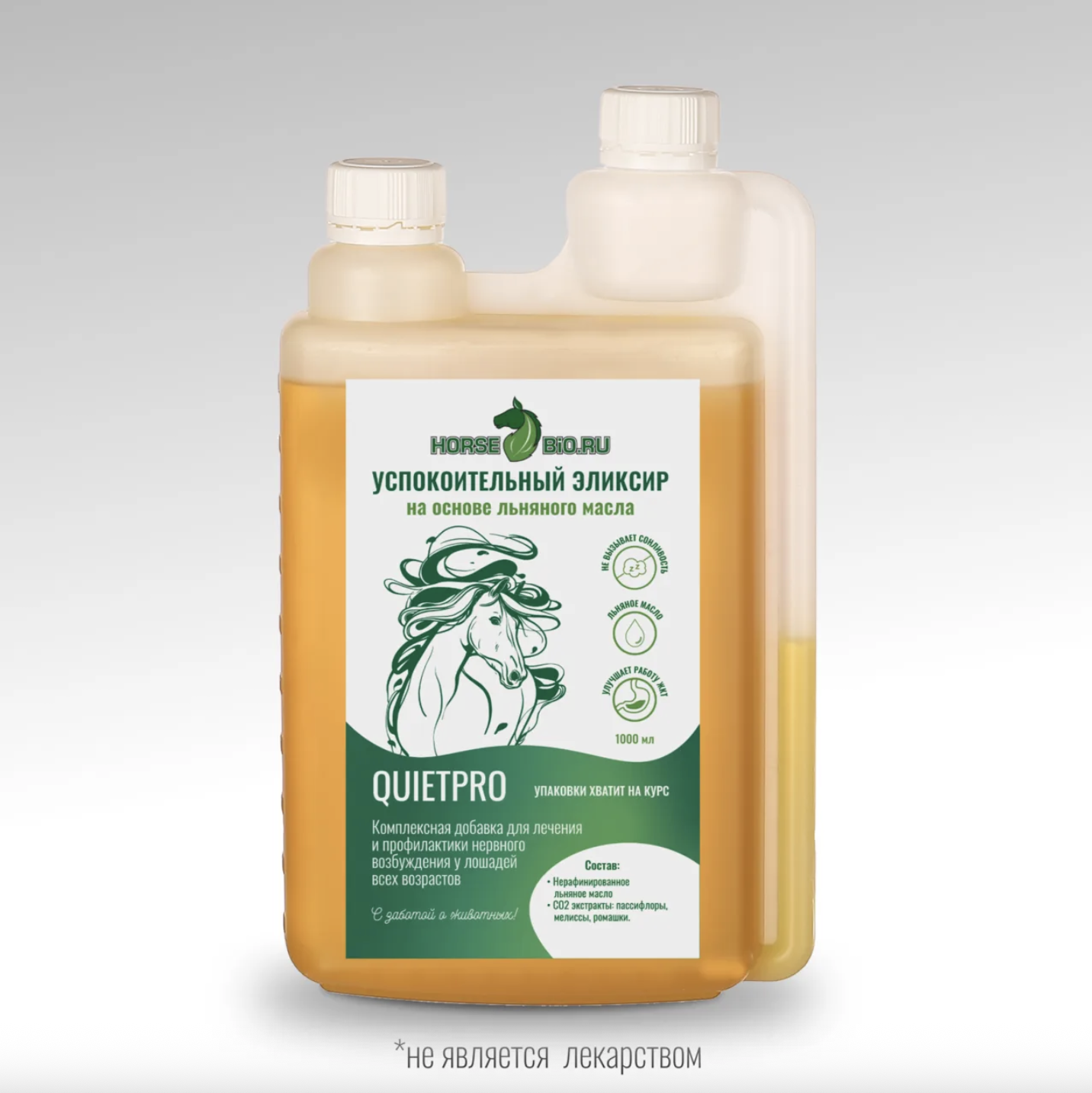 Натуральный успокоительный эликсир с экстрактами пассифлоры, мелиссы и ромашки для эффективного снятия нервного возбуждения, тревожности и агрессии у лошадей без снижения активности и концентрации.