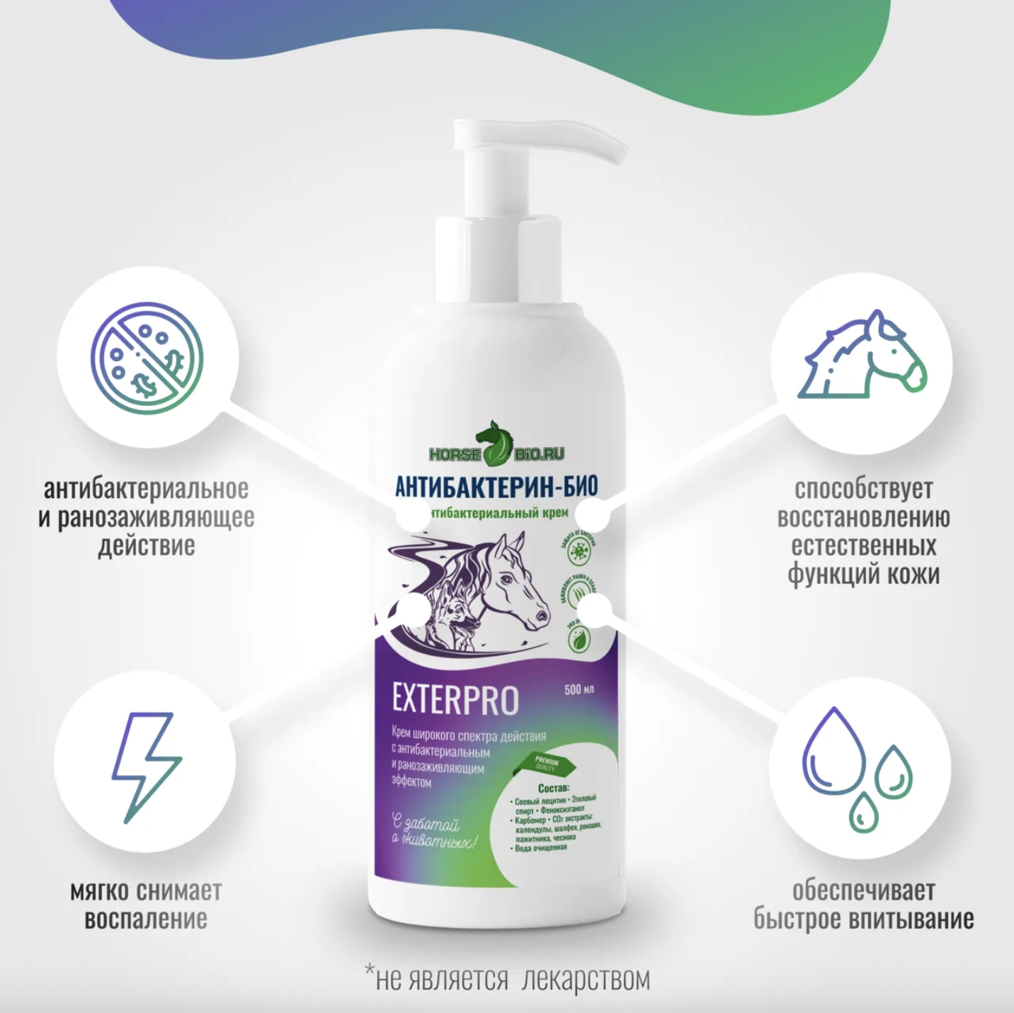 Профессиональный антибактериальный крем широкого спектра действия с выраженным ранозаживляющим и противовоспалительным эффектом. Эффективно борется с инфекциями, ускоряет регенерацию тканей и снимает воспаление при лечении ран, мокрецов и дерматита у лошадей, собак и кошек.
