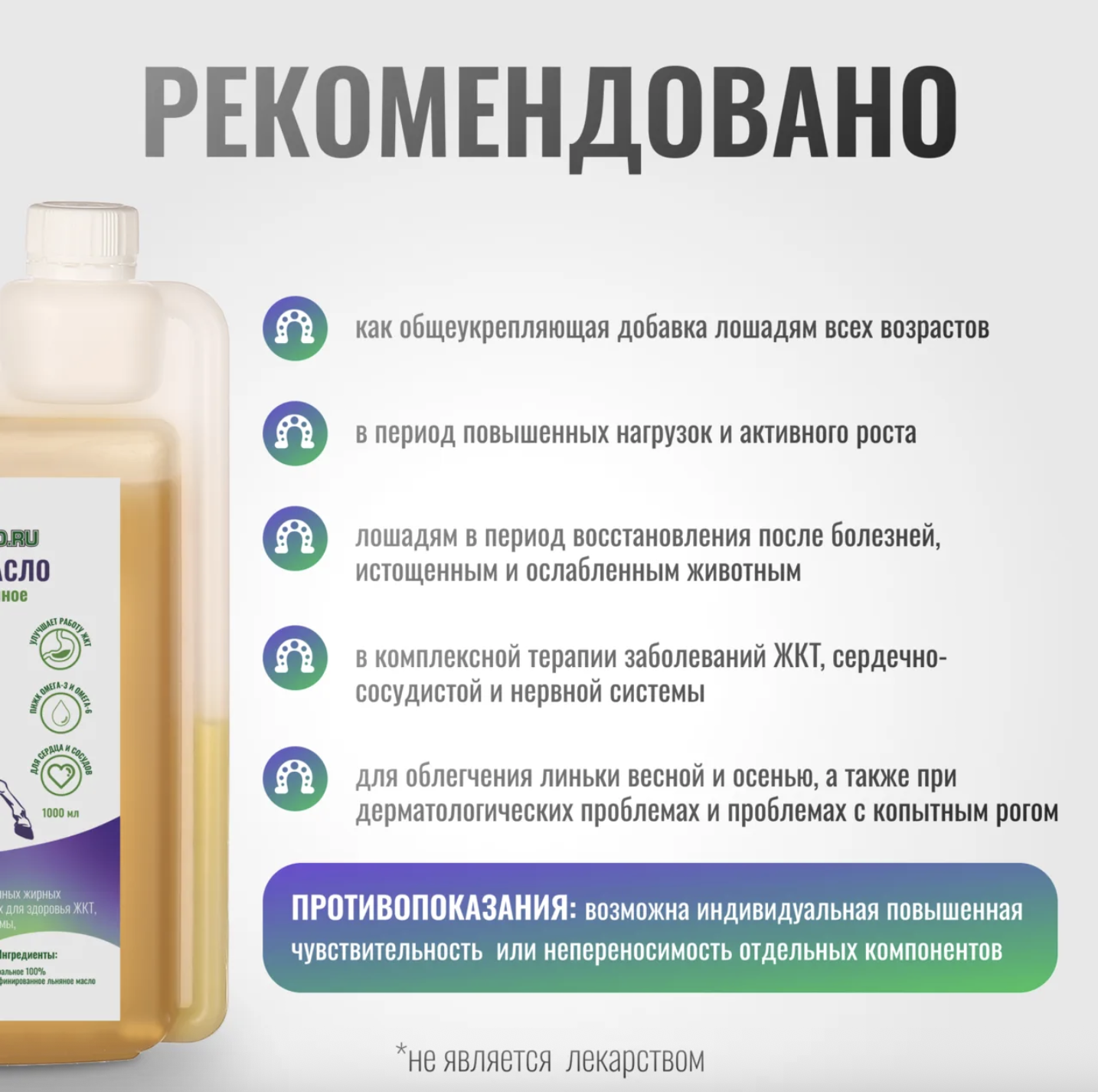 Действие: обладает целым спектром полезных свойств для организма лошади, положительно влияет на сердечно-сосудистую систему, благодаря содержанию полиненасыщенных жирных кислот, особенно Омега-3, которые помогают снизить уровень холестерина и липопротеинов низкой плотности, что значительно снижает риск болезней сердца.