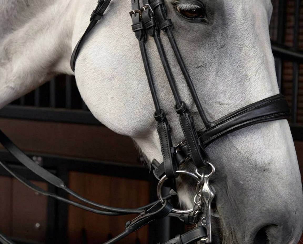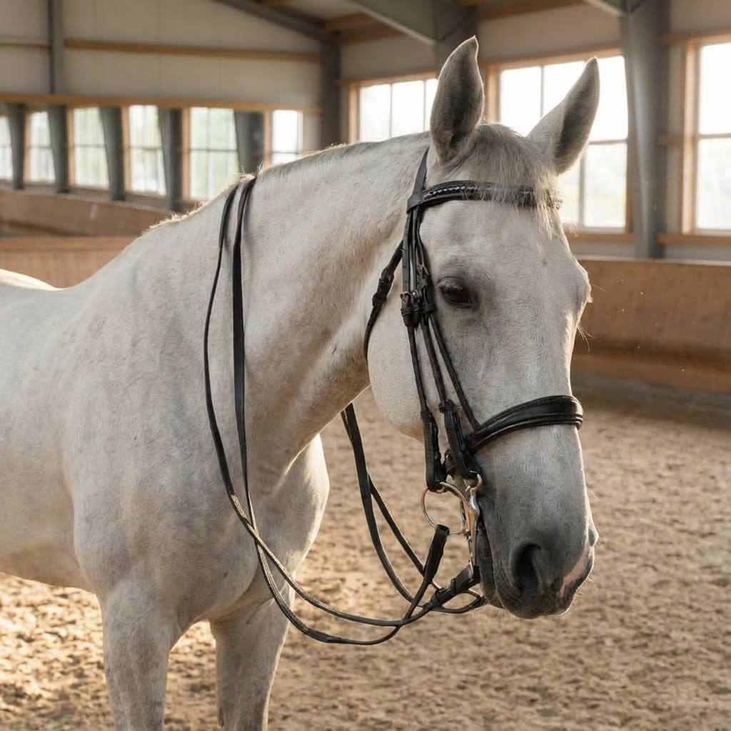 Мундштучное оголовье выполнено из кожи, дутые нащечные ремни и повод в комплекте